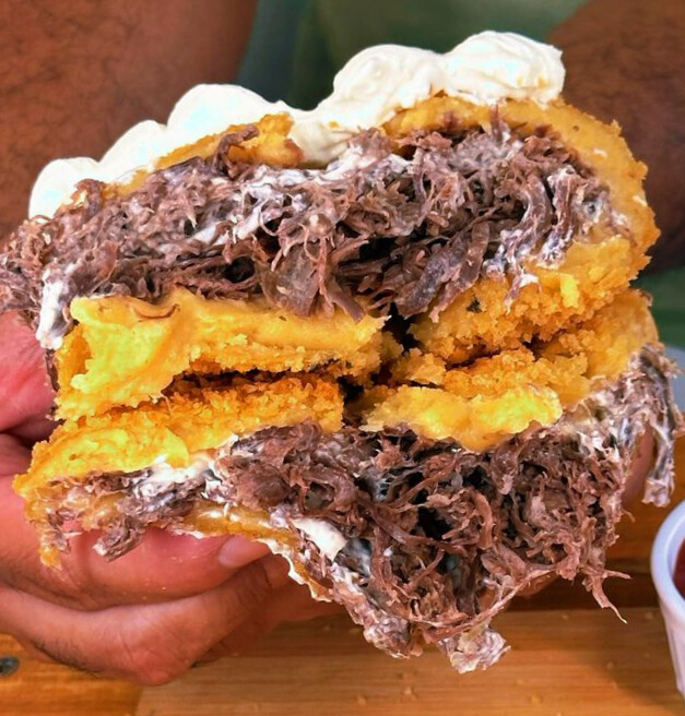É MUITO recheio! 400g de carne de sol desfiada, suculenta e temperada no ponto, com requeijão cremoso derretendo por cima + 1 Guaraná Antártica Gelada!