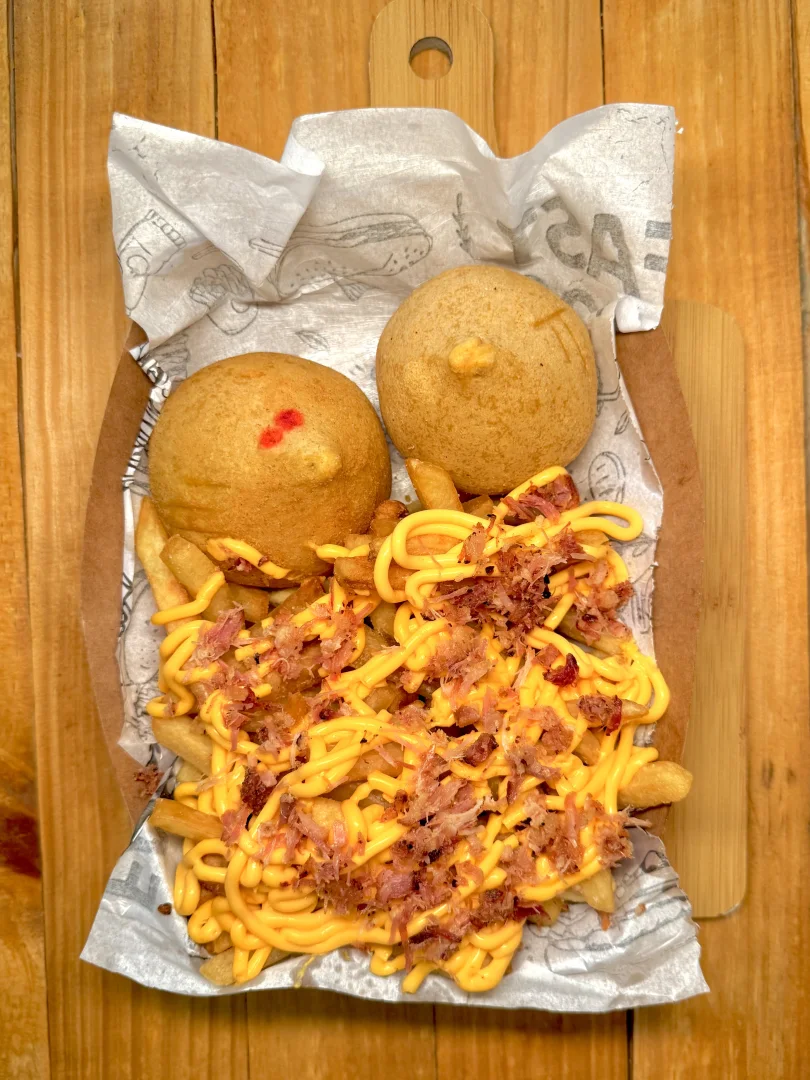 Duas coxinhas de frango tradicionais, crocantes por fora e suculentas por dentro, acompanhadas de uma porção generosa de batata frita (aprox. 150g) coberta com queijo cheddar cremoso e pedacinhos crocantes de bacon. Uma explosão de sabor que vai te fazer dizer: Oxe, que delícia!