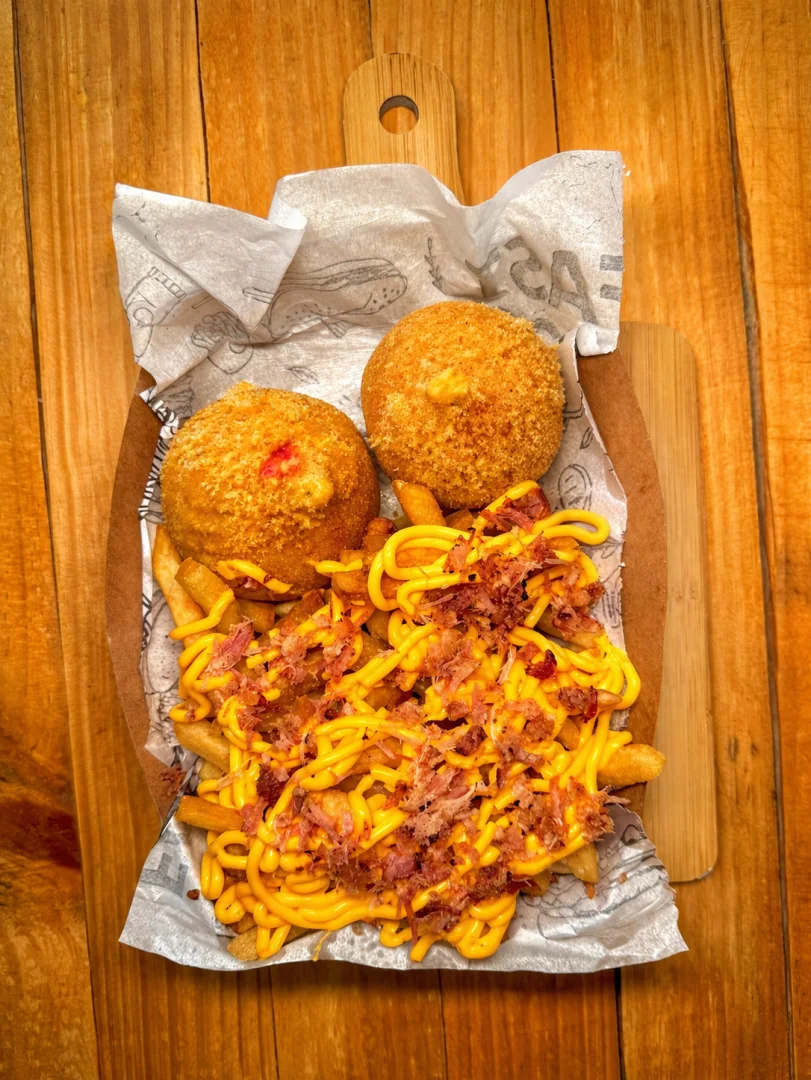 Duas coxinhas de frango tradicionais, crocantes por fora e suculentas por dentro, acompanhadas de uma porção generosa de batata frita (aprox. 150g) coberta com queijo cheddar cremoso e pedacinhos crocantes de bacon. Uma explosão de sabor que vai te fazer dizer: Oxe, que delícia!
