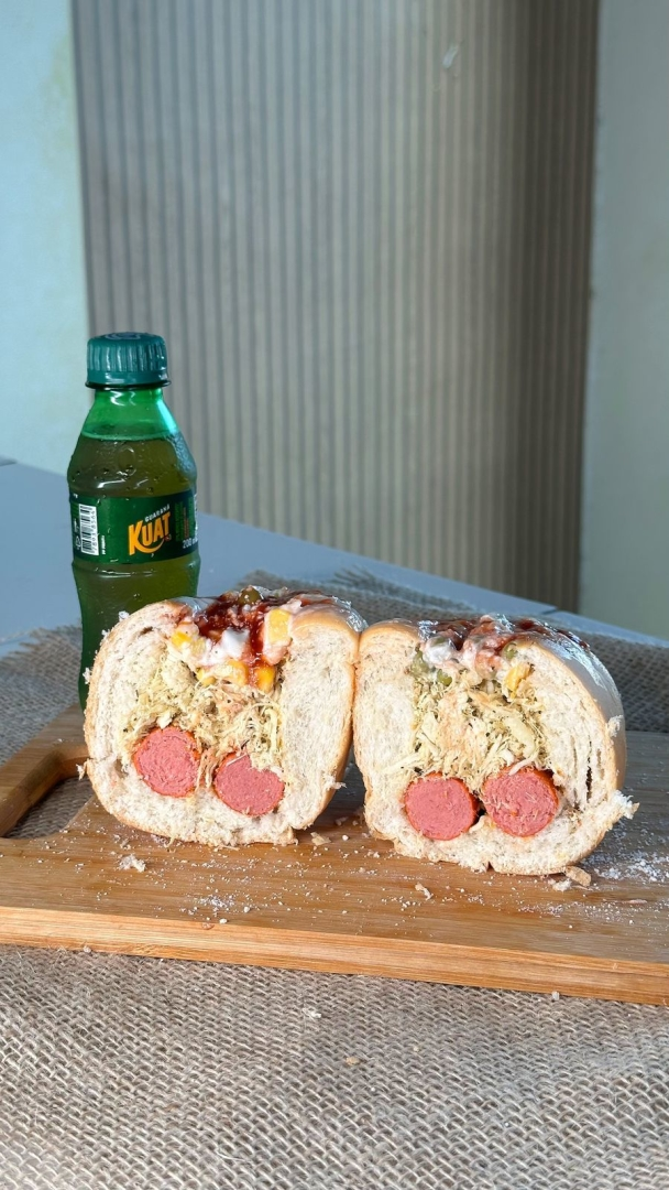 Pão seda de 18cm recheado com carne moída suculenta, duas salsichas, tomate, milho e ervilha. Tudo isso coberto com queijo parmesão ralado e o molho especial do Matuto.